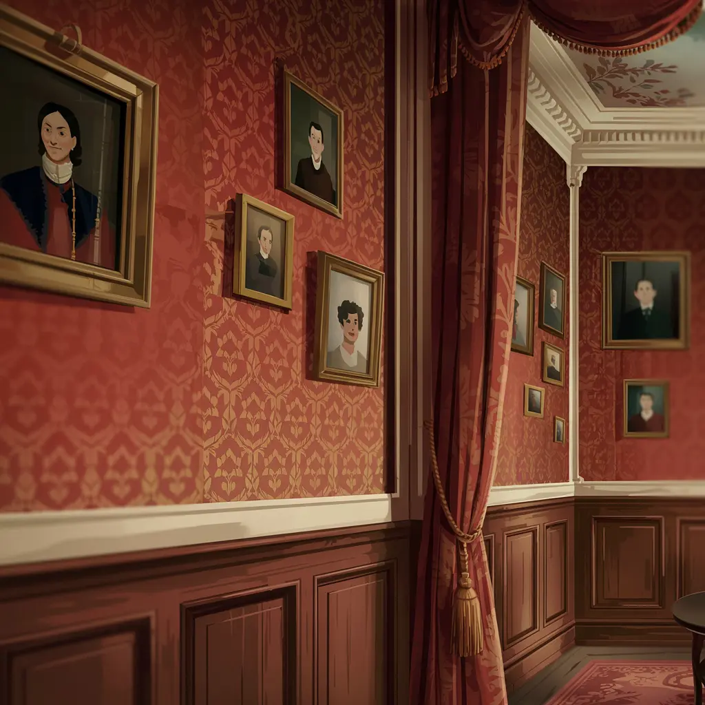 Upholstered chairs, small tables, a sofa and often a piano or harmonium filled the space. Heavy curtains framed tall windows, and picture walls above the mantel displayed family portraits in gilt frames alongside landscapes and prints.