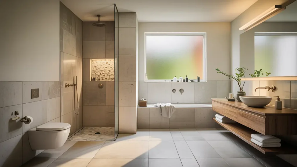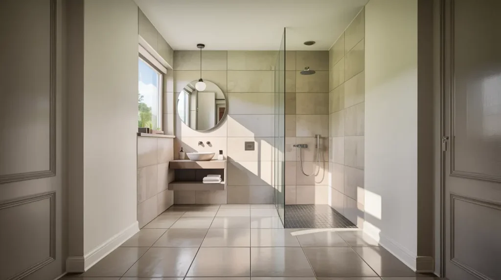 If your bathroom is tight, large-format tiles are one of the simplest ways to make it feel more open, because fewer grout lines break up the space less and your eyes read the room as one calm surface, and this works especially well in light to mid tones like warm white, soft beige, or pale stone looks, where the walls and floor feel connected instead of chopped into little squares.