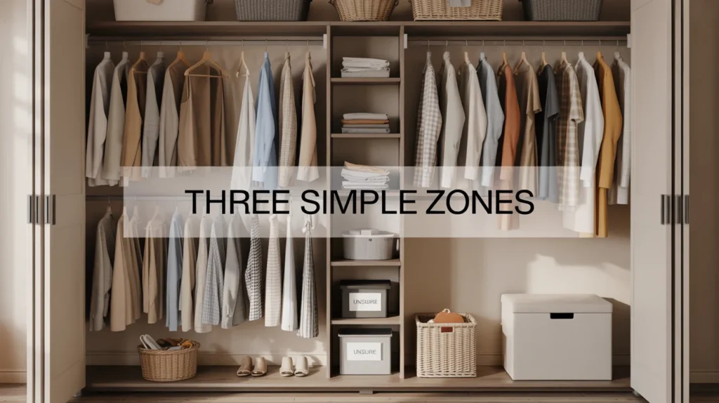 A wardrobe works better when it has zones, not piles. You do not need many zones. Three is enough for most people. The first zone is daily wear. These are the pieces you reach for every week. The second zone is occasional wear. These are your event outfits, seasonal extras, and backup layers. The third zone is holding space. This is where unsure items sit for a short time, not forever. This approach fixes a common problem. People try to organize everything equally. That looks neat for a day. It fails fast because daily wear gets buried under rarely used stuff.