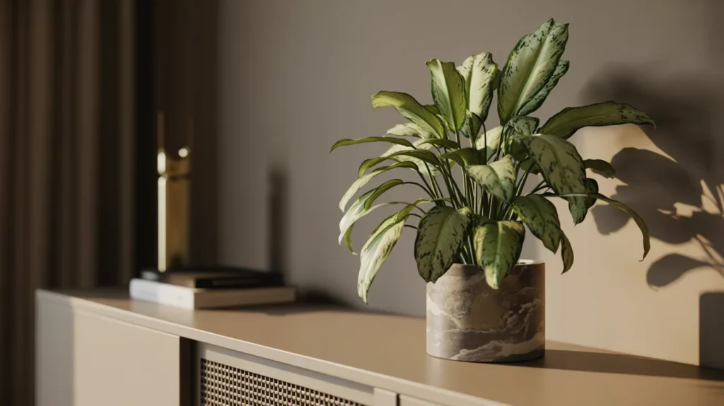Chinese evergreen adds gentle color and pattern. It can bring life to beige rooms without making them feel busy. It looks good on a sideboard, a credenza, or a desk. Choose a pot that matches hardware finishes, like matte black, brass, or warm stone. This small detail makes it look like part of the design plan.