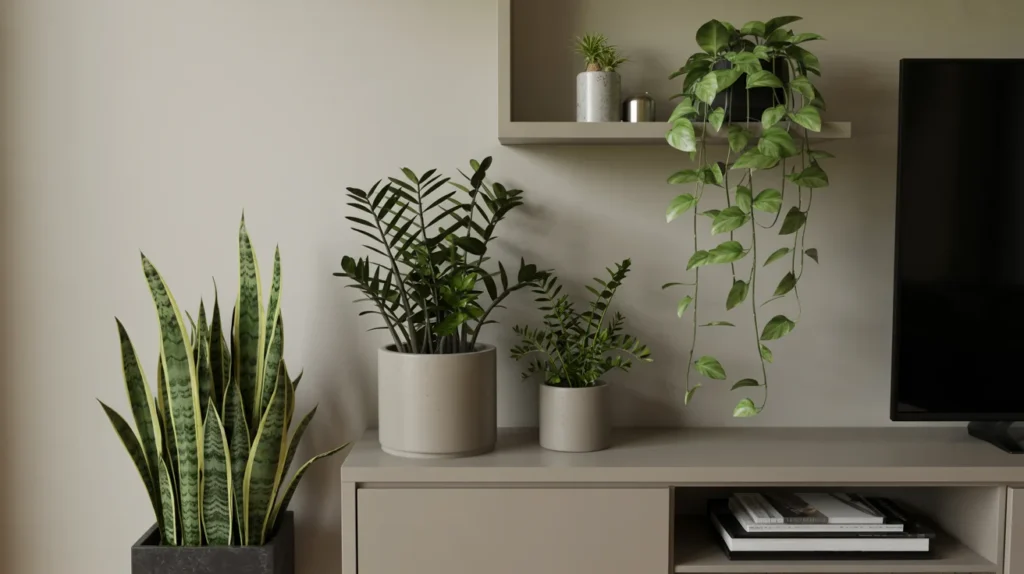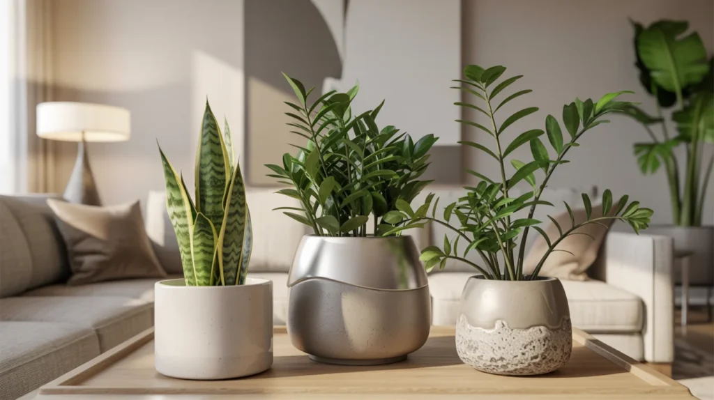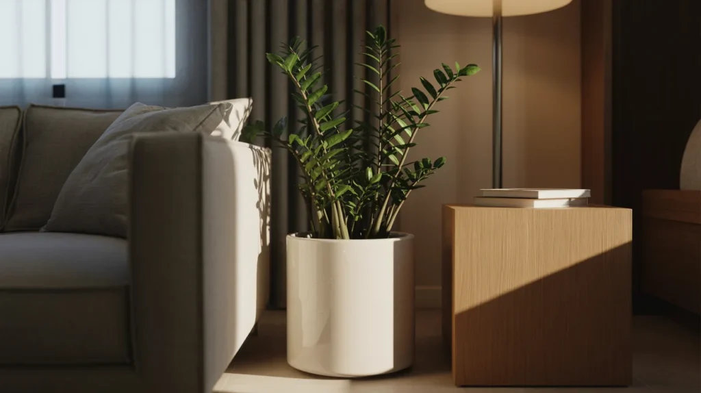 The ZZ plant has thick, glossy leaves that look polished. It works in modern homes because it has a clean silhouette. Place it in a matte ceramic pot or a simple cylinder planter. It looks best on the floor beside a sofa, in a reading corner, or near a media console. Keep the look sharp by hiding the nursery pot inside a heavier decorative planter.