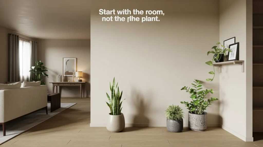 A plant should match the function and mood of the space. A bedroom needs calm forms and clean lines. A living room can handle taller shapes and bolder leaves. A hallway needs slim profiles so it does not block flow. When you pick plants this way, they look intentional, like furniture. They also stop feeling like random objects placed to fill a gap.
