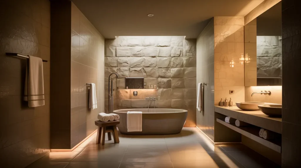 In the evening, or in rooms with little daylight, a few simple layers of artificial light take over. A warm ceiling glow on a dimmer lets you switch from bright cleaning mode to soft evening mode. Wall lights that skim stone or plaster add depth and make the room feel more interesting without adding clutter. Low lamps near the floor or under benches guide your steps during night time visits. A couple of candles now and then are enough to turn an ordinary soak into something that feels almost like a small ritual.