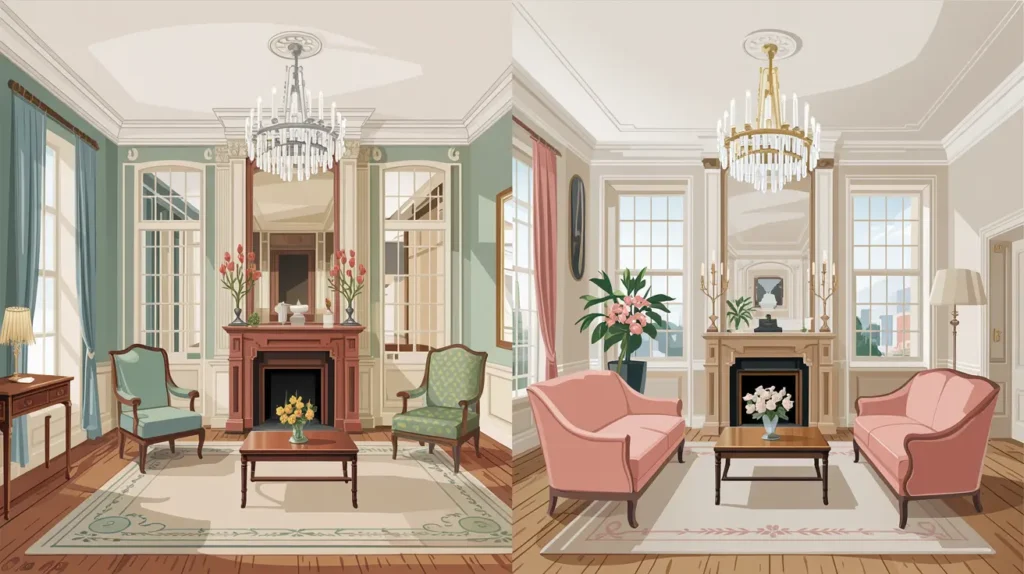 The earlier style we are exploring is gentler and more rooted in neoclassicism. It uses colour with care and keeps detail balanced. It can share some love of mirrors and metal, but it does not chase extremes.