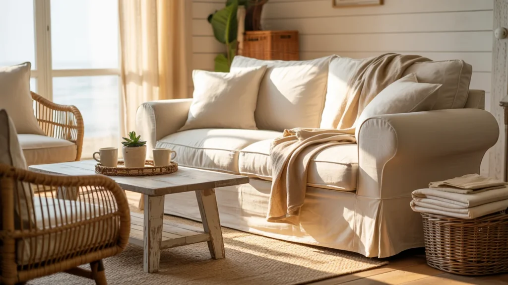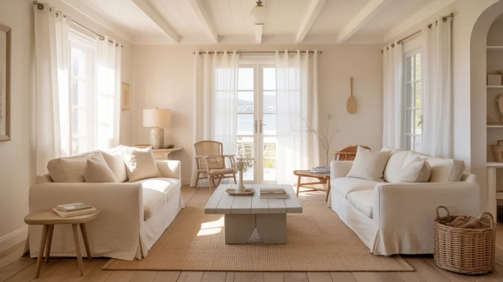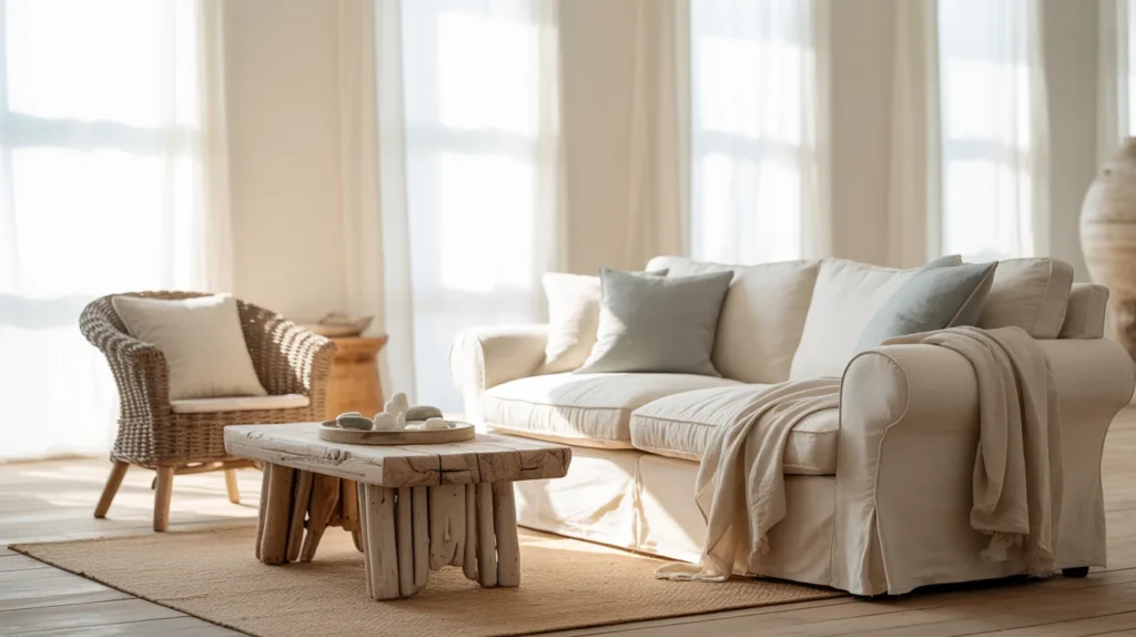 Start with warm white walls and a slipcovered sofa. Add a jute rug to ground the seating area. Bring in weathered wood through a coffee table or console. Use two pillows in soft blue, plus one neutral cushion. Hang art with calm coastal colors, not loud slogans. Finish with a basket to hide throws and daily clutter.