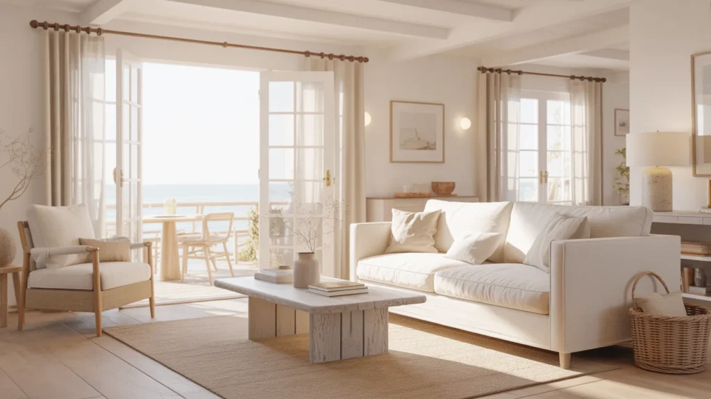 Seaside cottage style should feel calm, not staged. It is light, cozy, and a little imperfect. The best rooms look collected over time. They also work on normal, messy days. This look is not about beach props. It is about color, texture, and comfort.