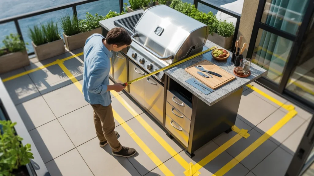 Place the grill on one side and prep on the other. Keep the middle walkway clear. This layout feels natural in tight spaces. It also keeps smoke away from the prep counter. Many roof decks and slim terraces suit this best.
