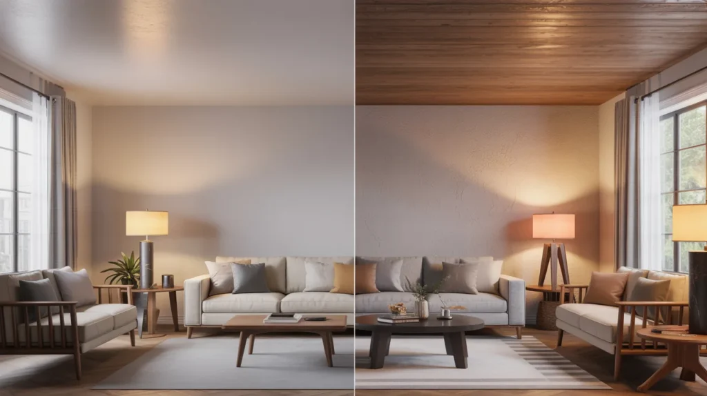 Edges matter. Trim hides gaps and makes the ceiling feel intentional. Use crown molding when the style fits. Use simple edge trim for modern rooms. Match trim color to the ceiling for a seamless look. Match trim to walls for a framed look.